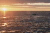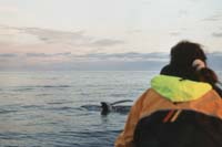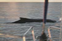 Der nördliche Horizont war purpurn gefärbt, der südliche silberblau. Unsere Blicke folgten den wenigen Möwen. Fast hatten wir uns damit abgefunden unter uns Menschen allein zu bleiben, als sich das Meer auftat. Ein tiefer schnaufender Atemzug, ein Rücken, lang wie das zweimastige Schiff. Mit scheinbarer Gleichmut verschwand er, wie er gekommen war. Das kein Gleichmut? Dieser tiefe Seufzer verriet ein Wissen um die Welt oder war es gar Geringschätzung der Geschwindigkeit unserer Yacht, Verhöhnung der kleinen nervösen Wesen die da an Deck auf und ab rennen? ‚Ihr Winzlinge, habt wohl noch kein Wal gesehen?’, schien er zu sagen. Und er war nicht allein gekommen. Der Buckelwal gehörte zu einer Schar von acht bis zehn Tieren, die sich mehr und mehr auf uns einließen. Ohne Misstrauen, ‚ruhend in sich selbst’, zogen sie um uns ihre Kreise. Von der Küste her wurden Weißschnauzendelphine auf uns aufmerksam. Halb im Flug, das ist wörtlich gemeint, stürzten sie auf uns zu. Sie quirlten zwischen uns und den Walen das Wasser auf und legten sich abwechselnd auf unsere Bugwelle. Ich versuche lieber nicht meine Gefühle zu beschreiben. Es war für uns alle nicht zu verarbeiten.