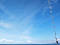 Zwischendurch hänge ich den passenden Stern in die Saling und passe auf, dass er da bleibt. Er zeigt mir, wo's lang geht. Plötzlich ziehen sechs pulsierende Lichter von Backbord den Himmel hinauf. Es mutet an wie ein stilles Feuerwerk. Es sind die Flieger aus der alten Welt. Frankreich, Spanien, von Daheim? Als der erste den Zenit erreicht, zieht eine Schnuppe rechtwinklig zur Flugbahn einen Strich über den Himmel. Es ist, als würde der liebe Gott von der anderen Seite mit einem Fingernagel über das Dunkel kratzen. Ich bin voll Ehrfurcht. Zwei weitere Sternschnuppen werden mir noch Wünsche erfüllen. Welche, verrate ich nicht. Dann beginnt es sich zu zuziehen. Zuletzt sehe ich noch die Venus ziemlich im Norden aufgehen. Sie hat heute also keinen weiten Weg. Und es fängt an zu grauen.